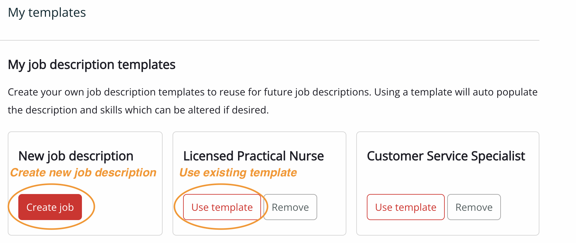 4. You will be taken to the My templates page. This page stores all your previously saved templates. To create a job, you can either use an existing template by clicking on Use Template OR you can create a new job description by clicking on Create Job.