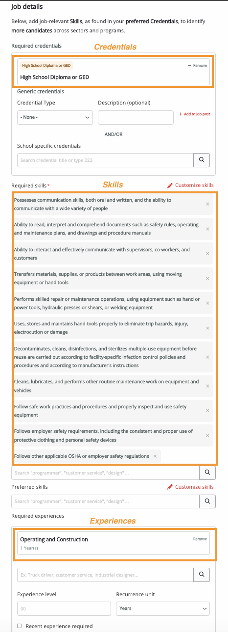 7. To match you with the right candidates, list out the minimum Required credentials, skills, and experiences under the Job details section. (See this article to learn how to add credentials, skills, and experiences to a job posting)