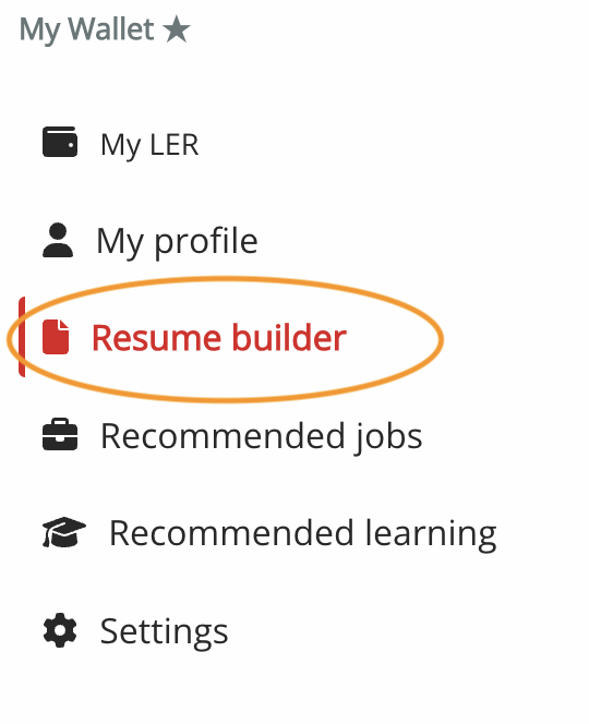 1. From your Learner/Earner Wallet, click on Resume Builder on the left menu.