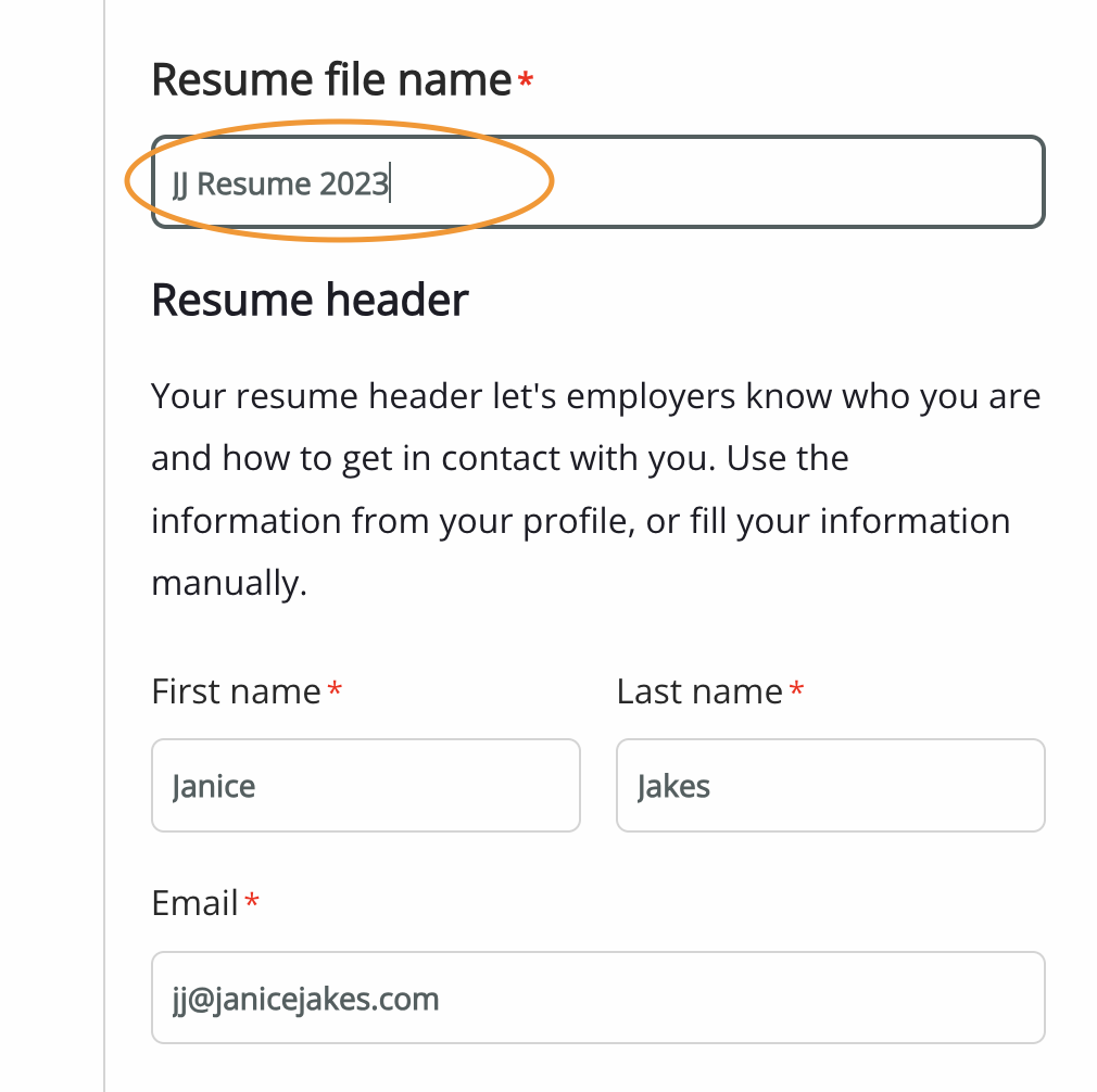 3. Enter a Resume File Name. Since a Learner/Earner can build more than one resume, you must give each one a unique name. This resume name will be visible to employers.