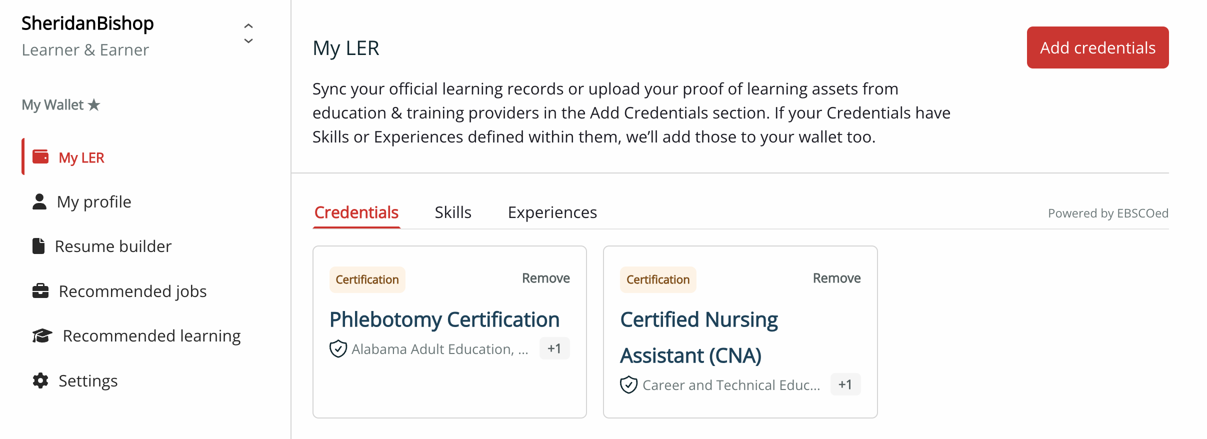 My LER is a feature provided by the Alabama Talent Triad that helps Learner/Earners manage their verified Learning and Employment Records (LERs). It provides a centralized location for Learner/Earners to store and manage their verified credentials and skills, making it easier for them to showcase their achievements and qualifications to potential employers. You can use the credentials, skills, and experiences that you have stored in your LER to build your resume.