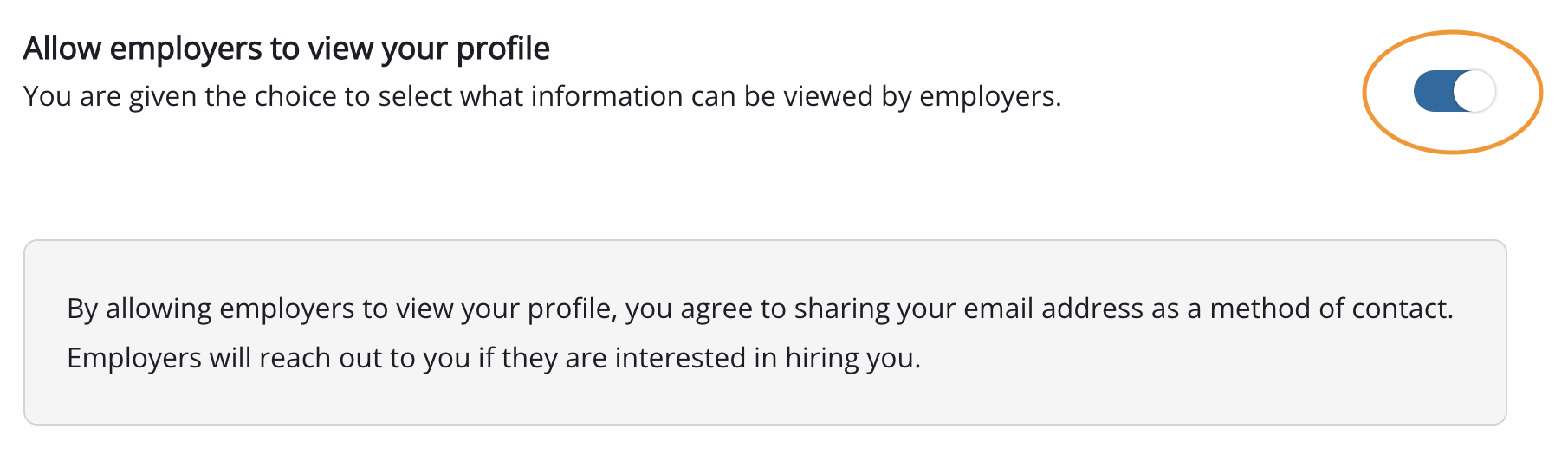 3. At the bottom of the form you will find the "Allow employers to view your profile" button. If you wish to allow employers to view your profile, move the slider button to the right so that the blue appears.