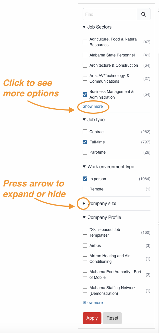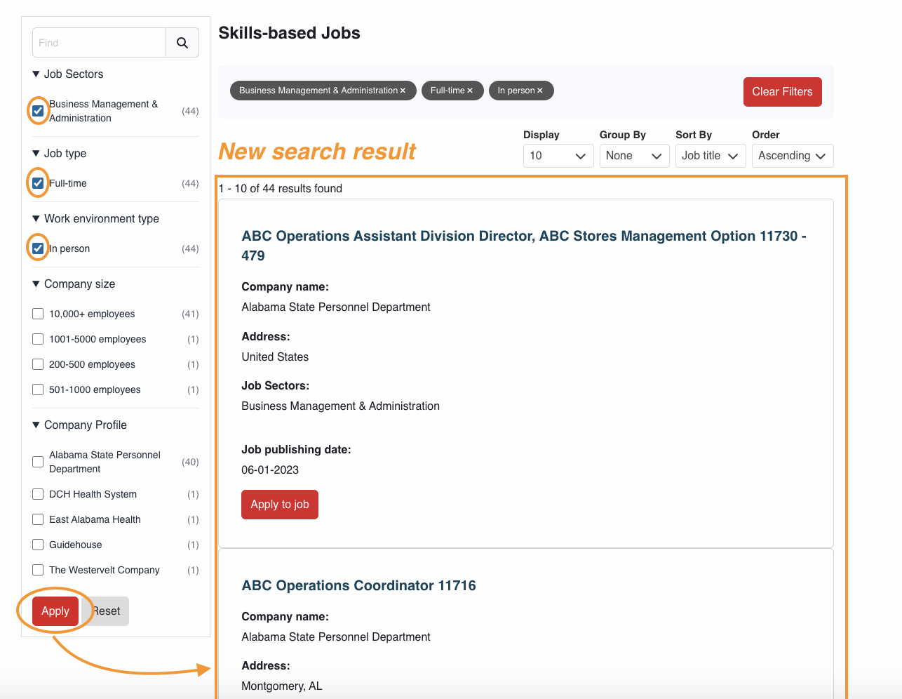 3. Press the Apply button once you are done with your selection. In the example below, only "Full-time" "In person" jobs related to the "Business Management & Administration" sector will be included in the results once you press the Apply button.