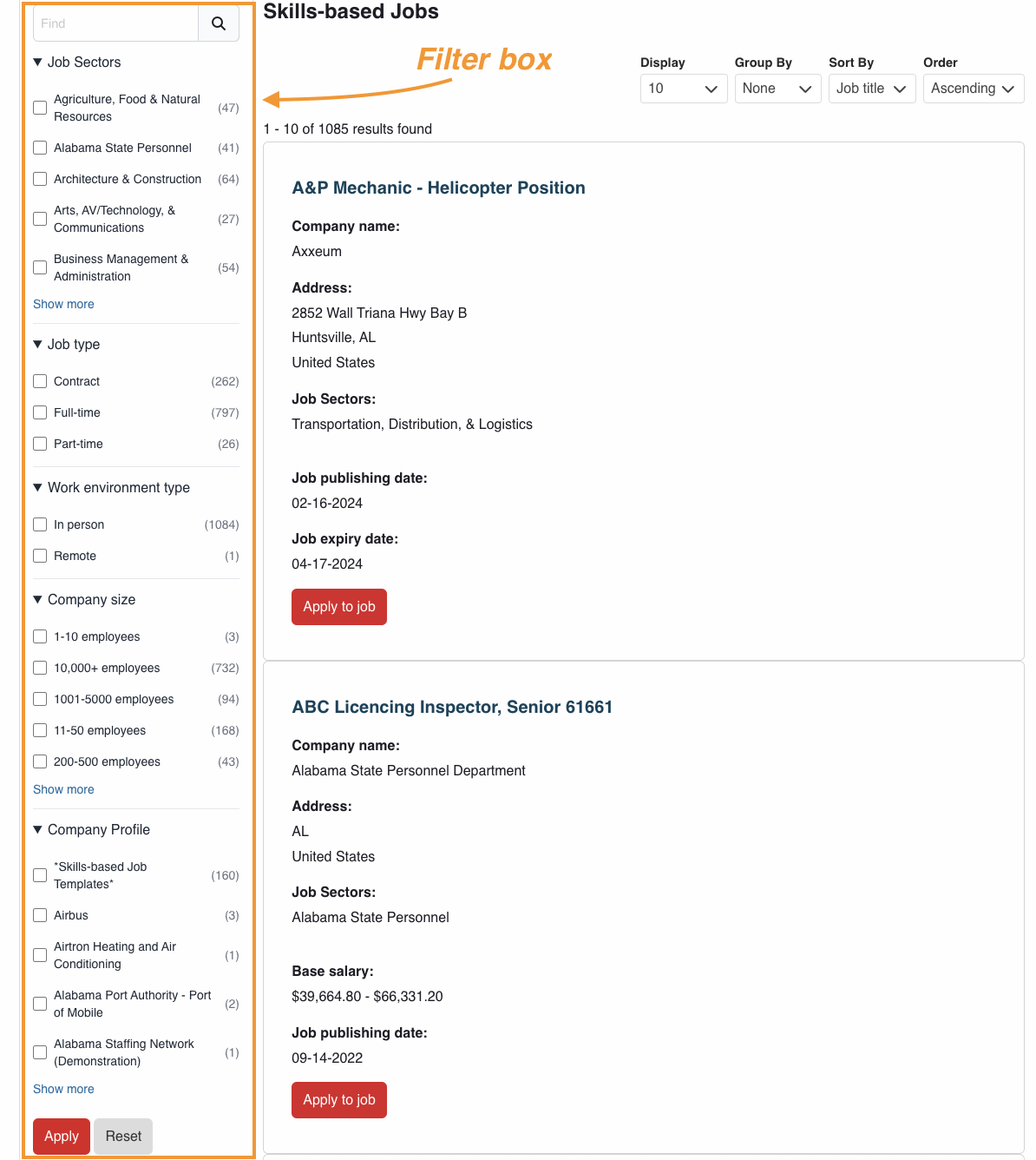 1. Use the filter box located at the left side of the result page to filter your result. For example, when searching for Skill-based jobs, you may filter your result by Job Sectors, Job type, Work environment type, Company size, and Company Profile.