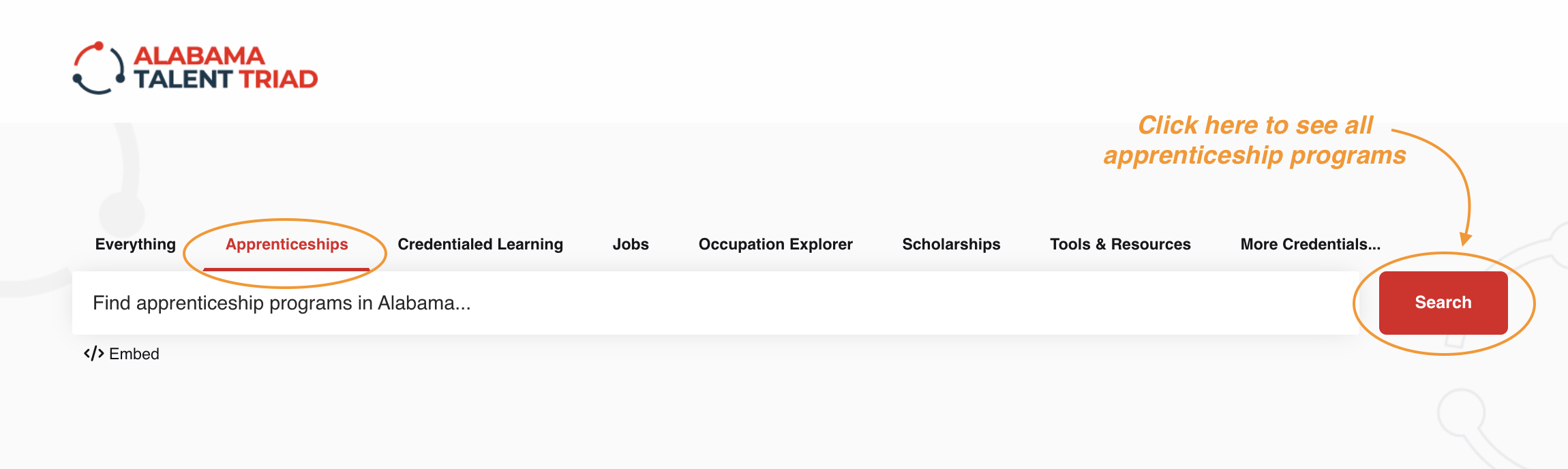 - Visiting the homepage and clicking on the "Apprenticeship" tab from the top menu. To search for ALL apprenticeship programs in Alabama, click on the Search button under this tab.