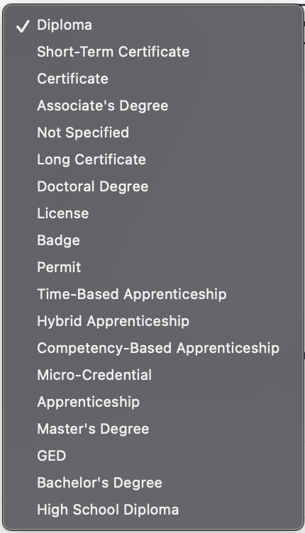 Credential Types May 01, 2024 21:12 Updated The following Credential types are available. Related articles Access your institution’s credentials Create a credential for your institution Credential Registry: "Verified by" Edit your institution's credentials Credential Registry: Issuer