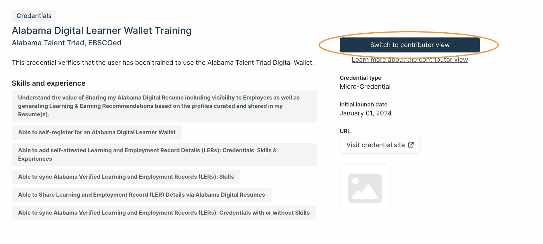 4. The contributor view allows you to view and edit a credential. See this article for more details on how to edit a credential from your institution.
