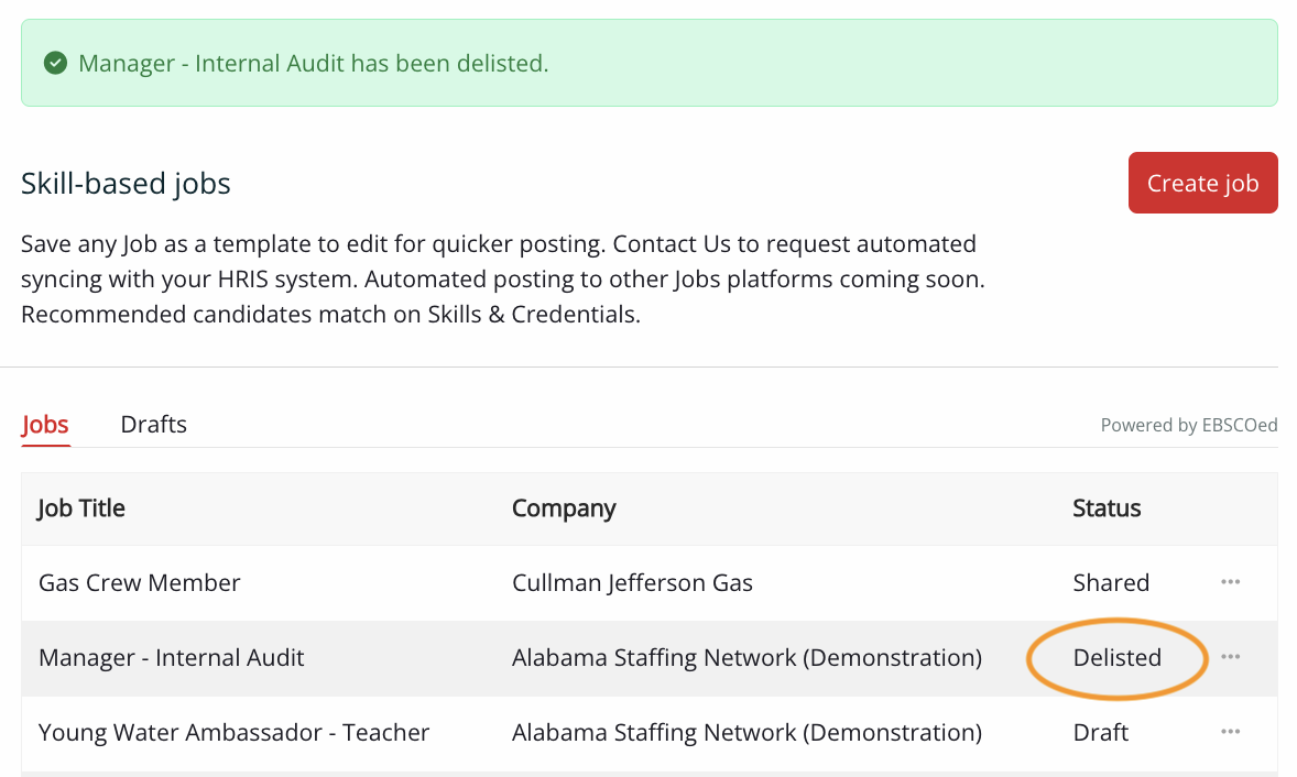 When the Status has been changed to "Delisted" as shown below, the job has been successfully deleted and is no longer visible to the public.