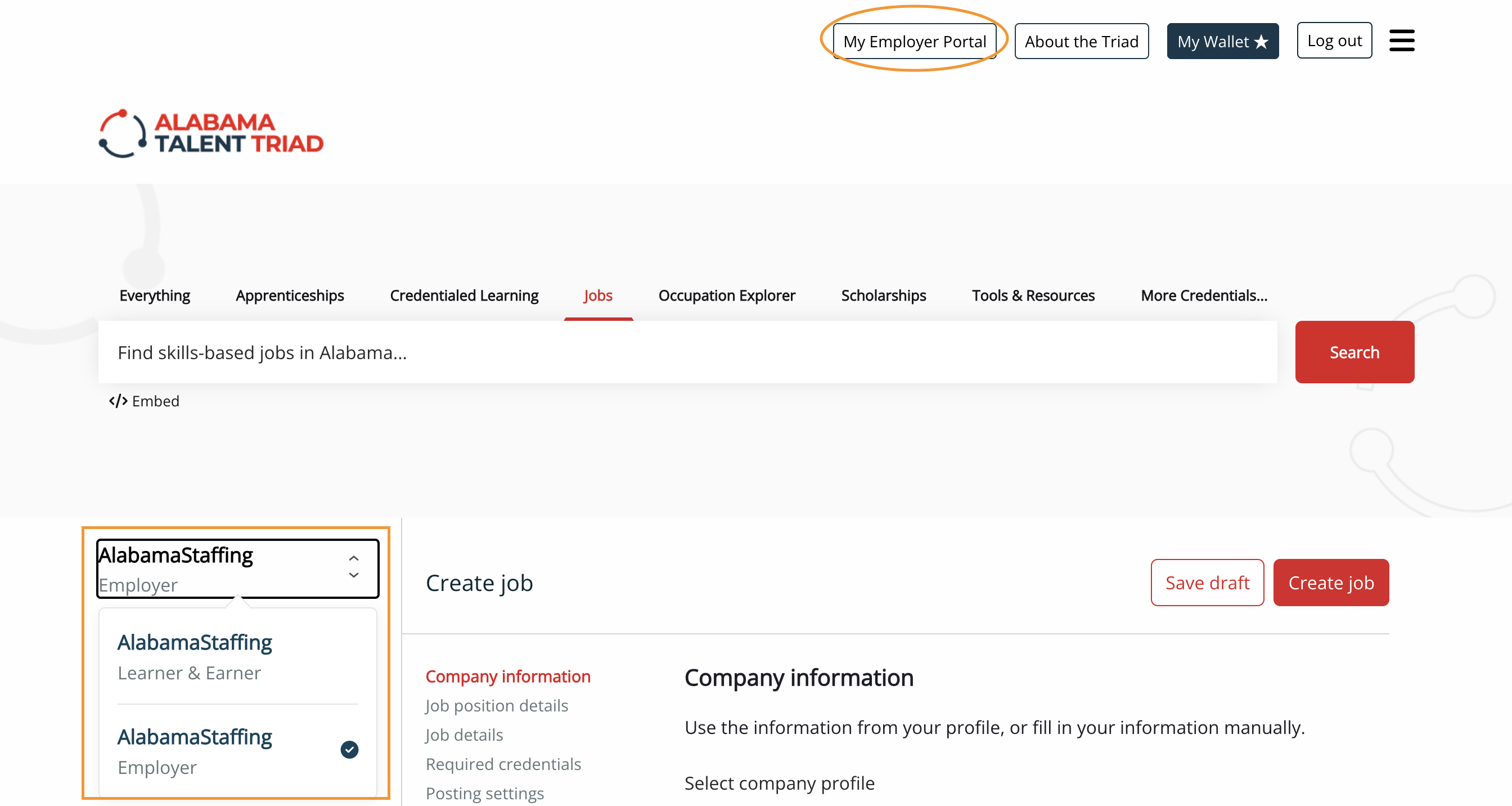 1. Go to your Employer profile by clicking on My Employer Portal at the top. Alternatively, you can also click on your name in the left column and select the Employer role from the drop down.