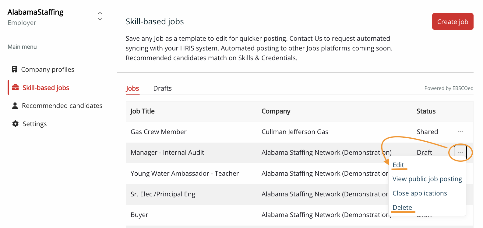 3. Find the job you wish to edit/delete and click on the 3-dot icon to the right side. Click on Edit to update the job posting (See Step 4) OR click on Delete to delete the job posting (See Step 5).