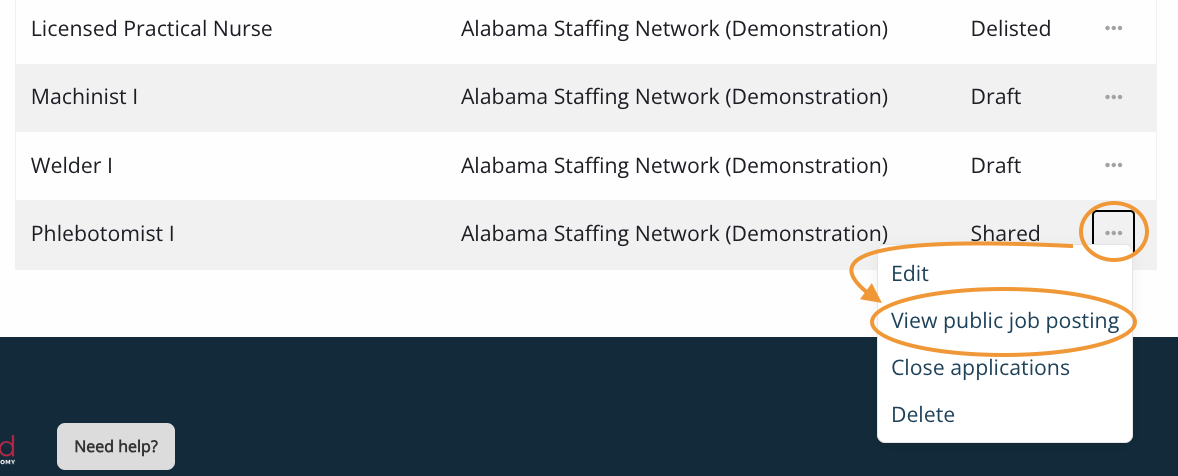 4. Find the job you wish to view, click on the 3-dot icon to the right side, then select View public job posting.