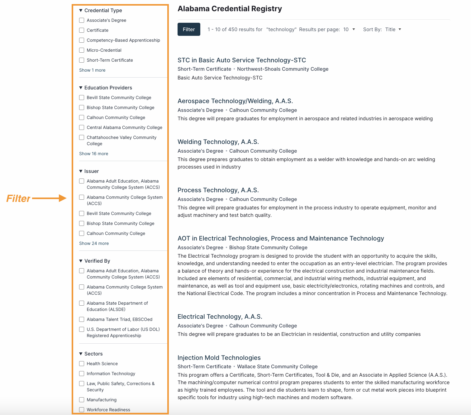 You may also filter your search results by Credential Type, Education Providers, Issuer, Verifying Provider, and/or Sectors by checking the boxes on the left side of the results page.
