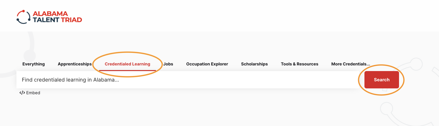 To search for all credentials, go to the “Credentialed Learning” tab from the top menu and click on the Search button.