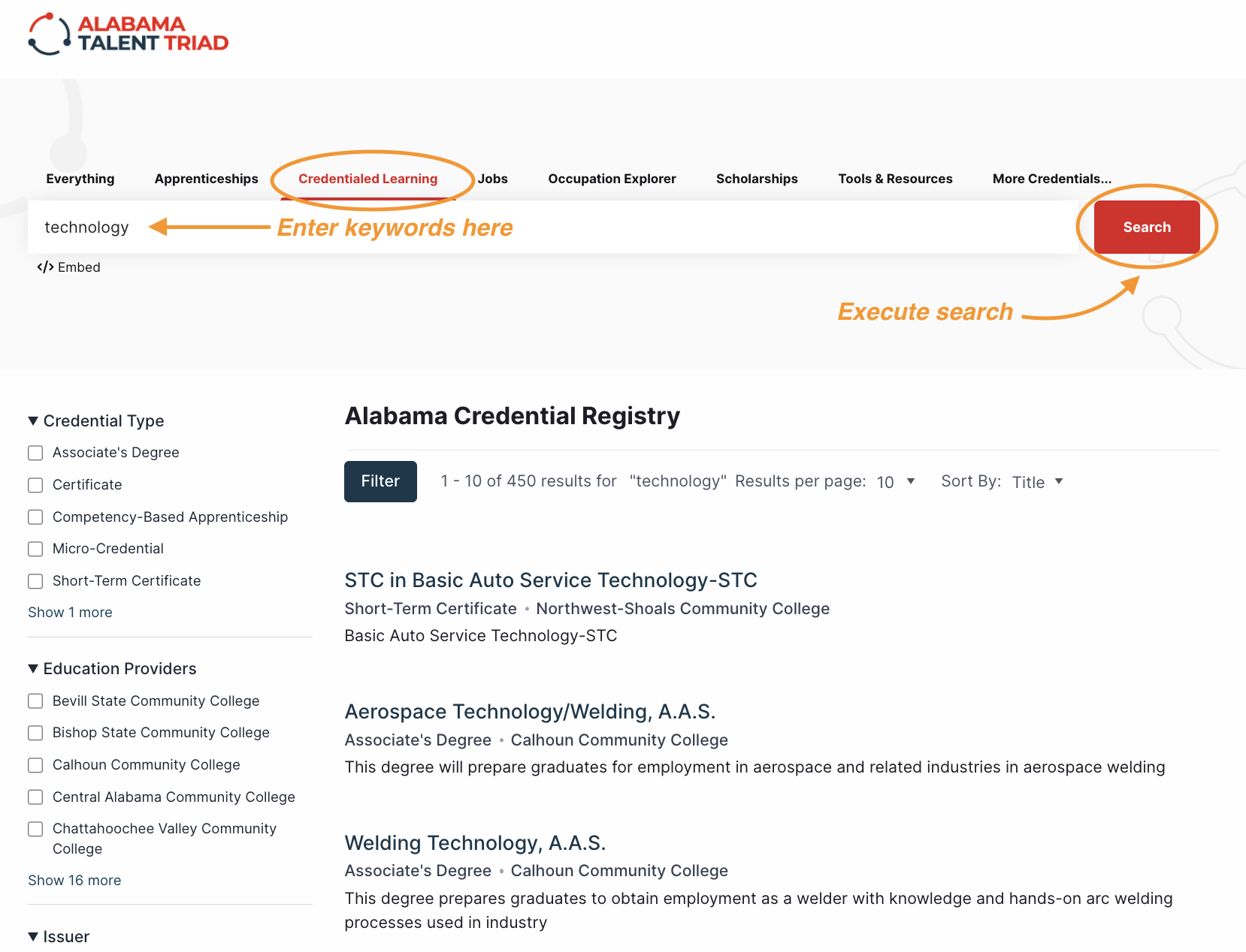 To search for credentials by keywords, enter a search (keyword) term into the search bar under the “Credentialed Learning” tab. Once you have entered your search term, click Search to execute the search.