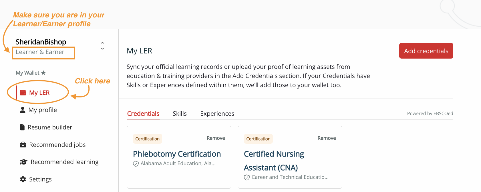 1. Go to your Learner/Earner profile and click My LER from the left menu.