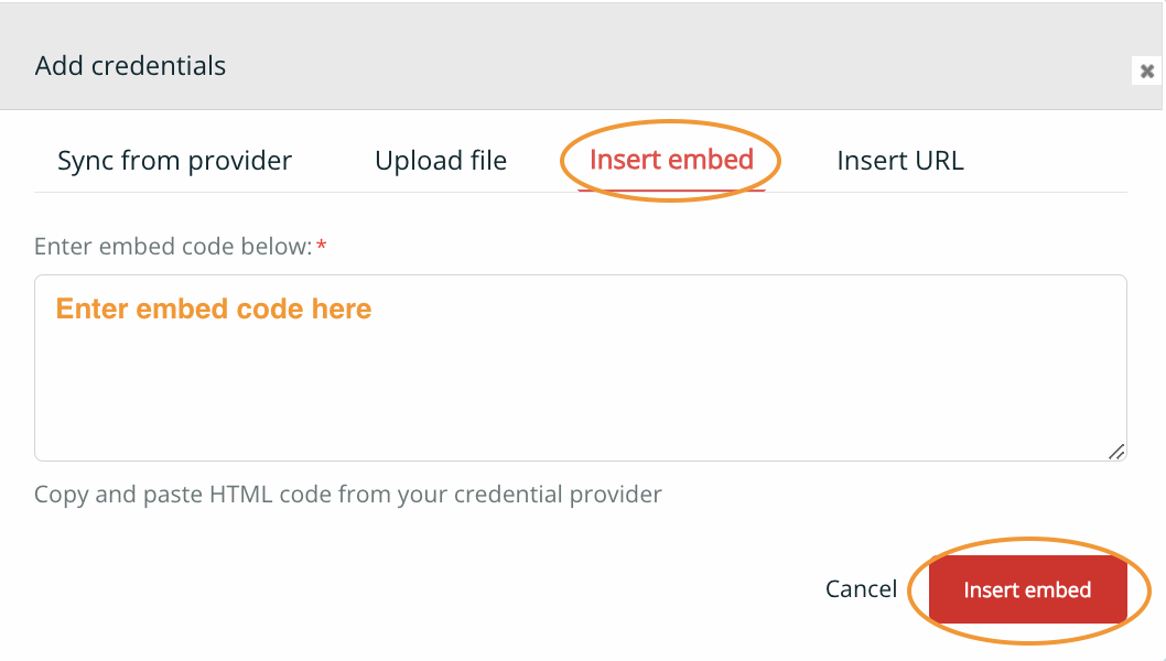 5. Enter embed code from your credential provider in the box.